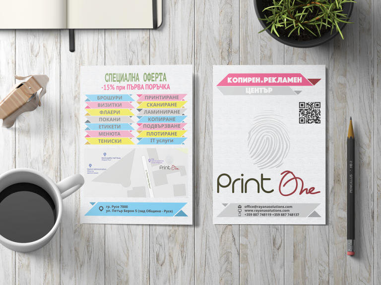 Копирен и рекламен център “Print One” предлага услуги, свързани с цялостната изработка на рекламни материали. Нашата дейност е насочена към комплексното рекламно обслужване, а именно: предпечат, печат, изработка и монтаж на всички видове реклама и материали в областта на визуалната комуникация и графичния дизайн.