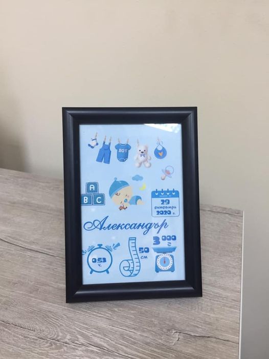 Бебешка визитка в бяла или черна рамка с размер А5 с възможност и за окачване на стена, което я превръща в уникална декорация на детската стая.