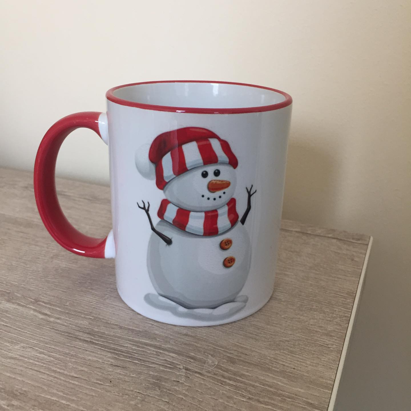 Коледна чаша Снежен човек с червен кант и червена дръжка – налична