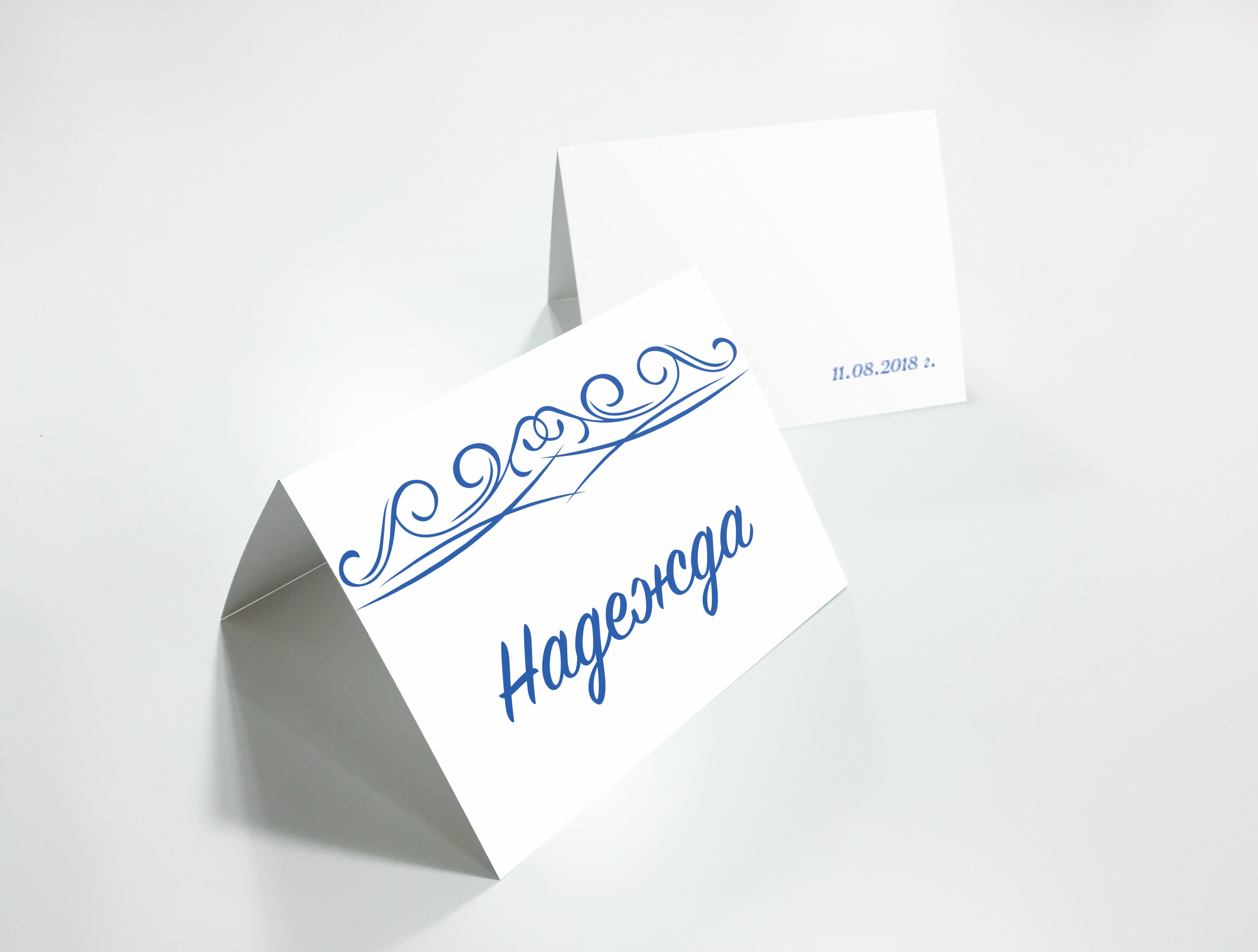 Картичка с имена на гости „Blue“, отпечатана върху луксозен перлен картон Галакси кварц silver/gold с размери 9х5 см в сгънато състояние
