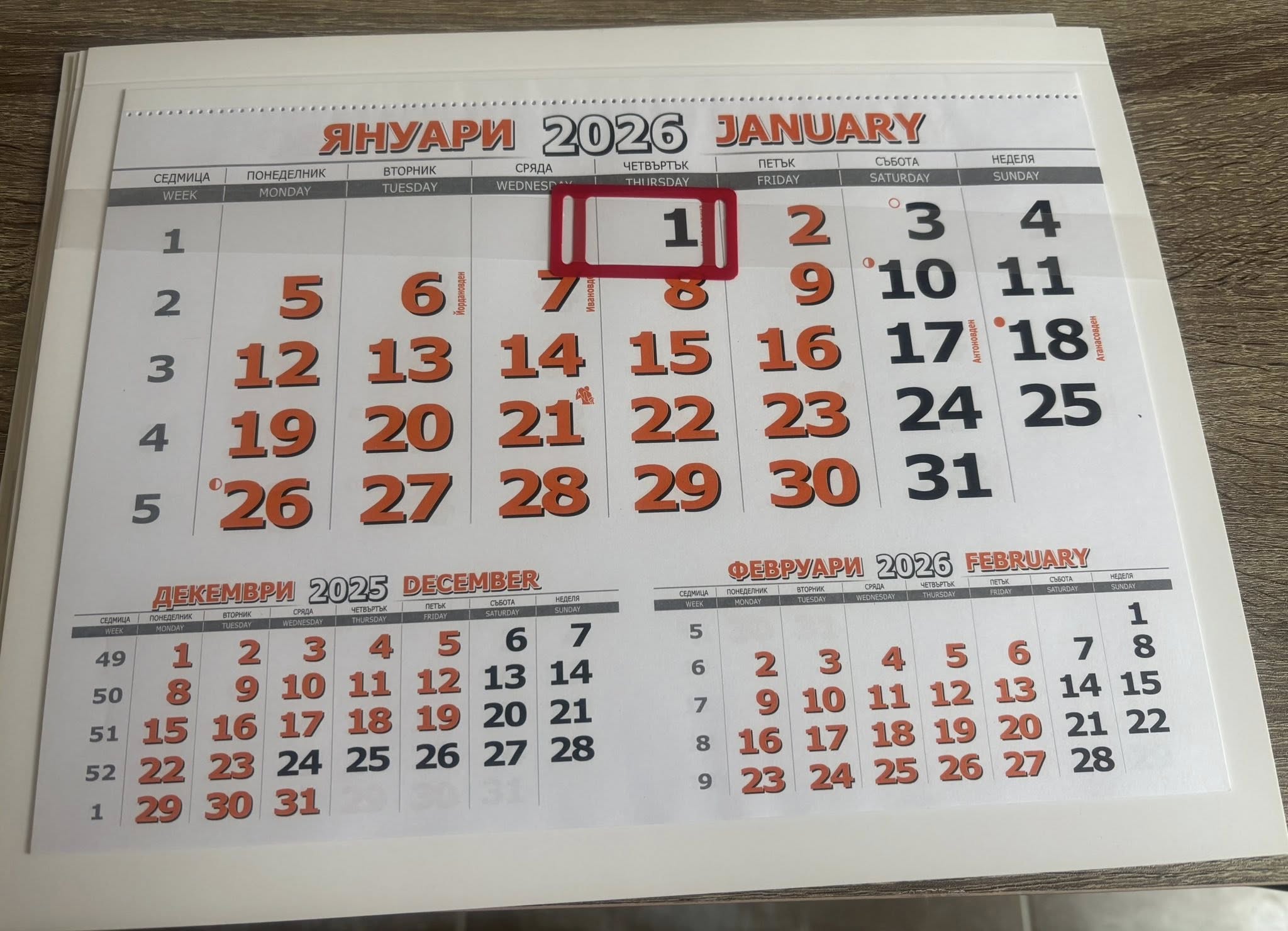 Работен календар 2026 с една секция – телата се предлагат в „златен“, червен, син, зелен и оранжев цвят.