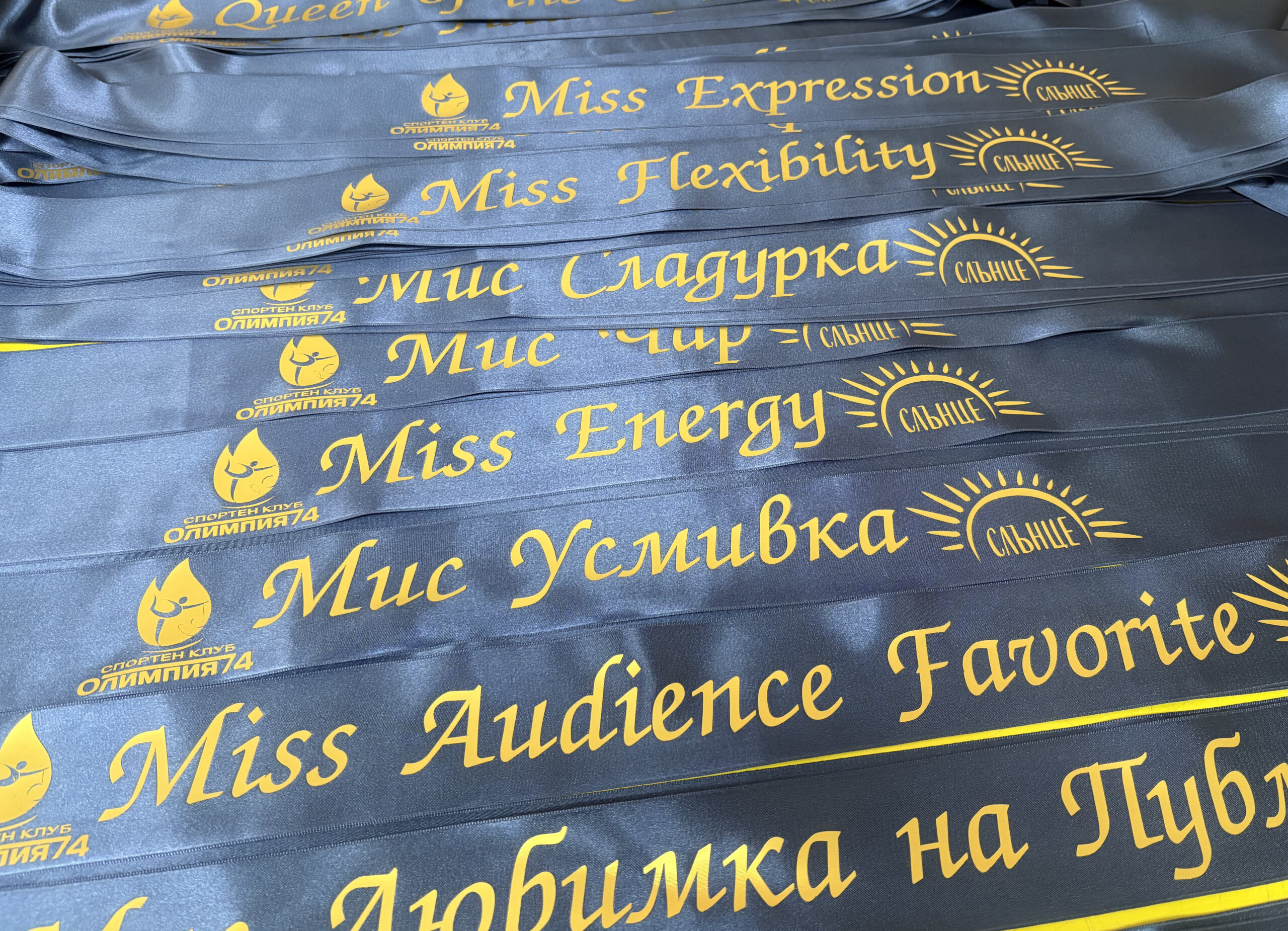 Сатенени ленти, подходящи за моминско парти, абитуриентски бал, випуск или други събития. Надписът е с термотрансферно текстилно фолио в цвят по ваш избор, изцяло съобразен с темата на събитието