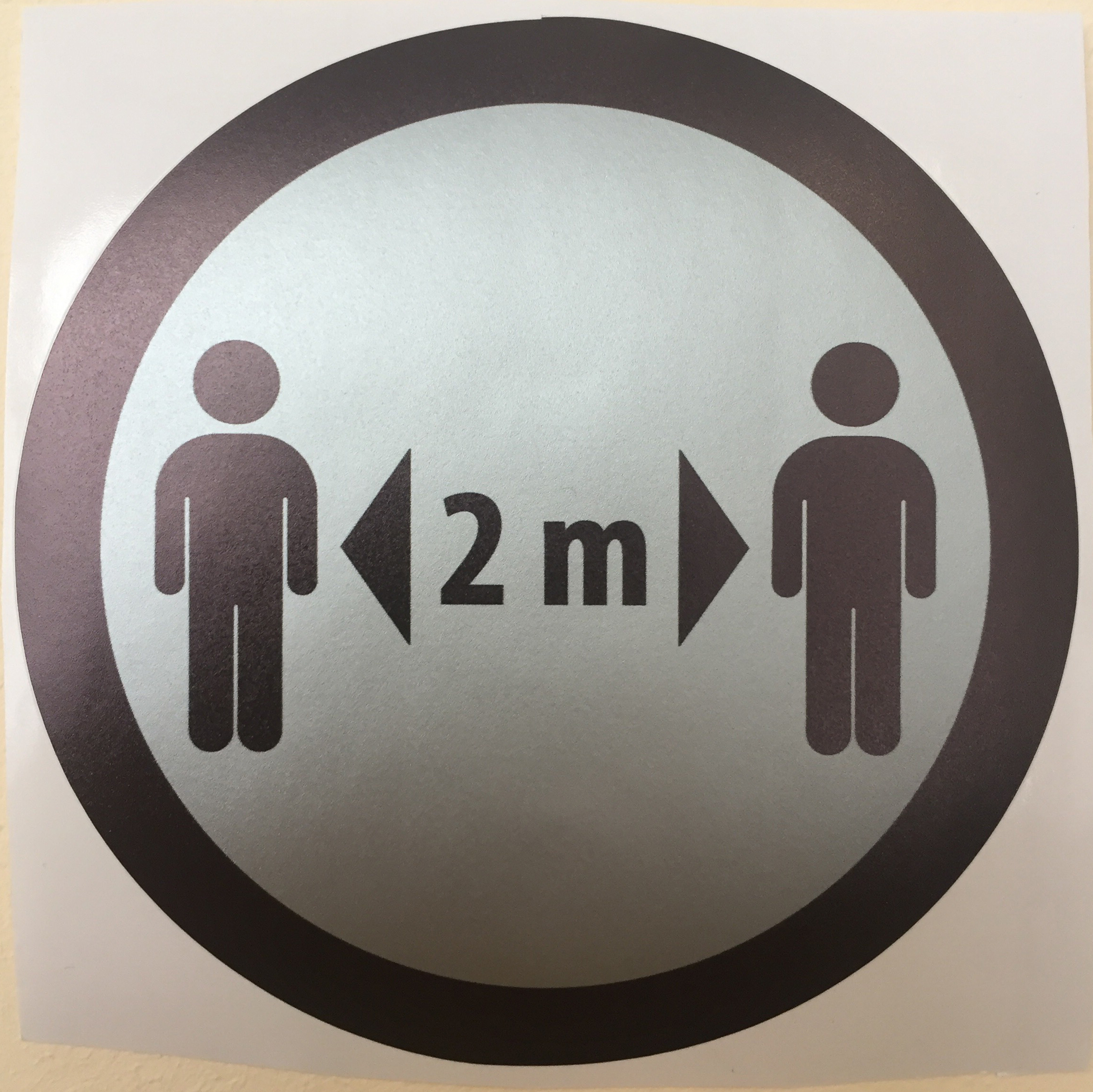 Стикер “Спазвай дистанция”с диаметър 11 см, отпечатан върху сиво металик самозалепващо ПВЦ фолио