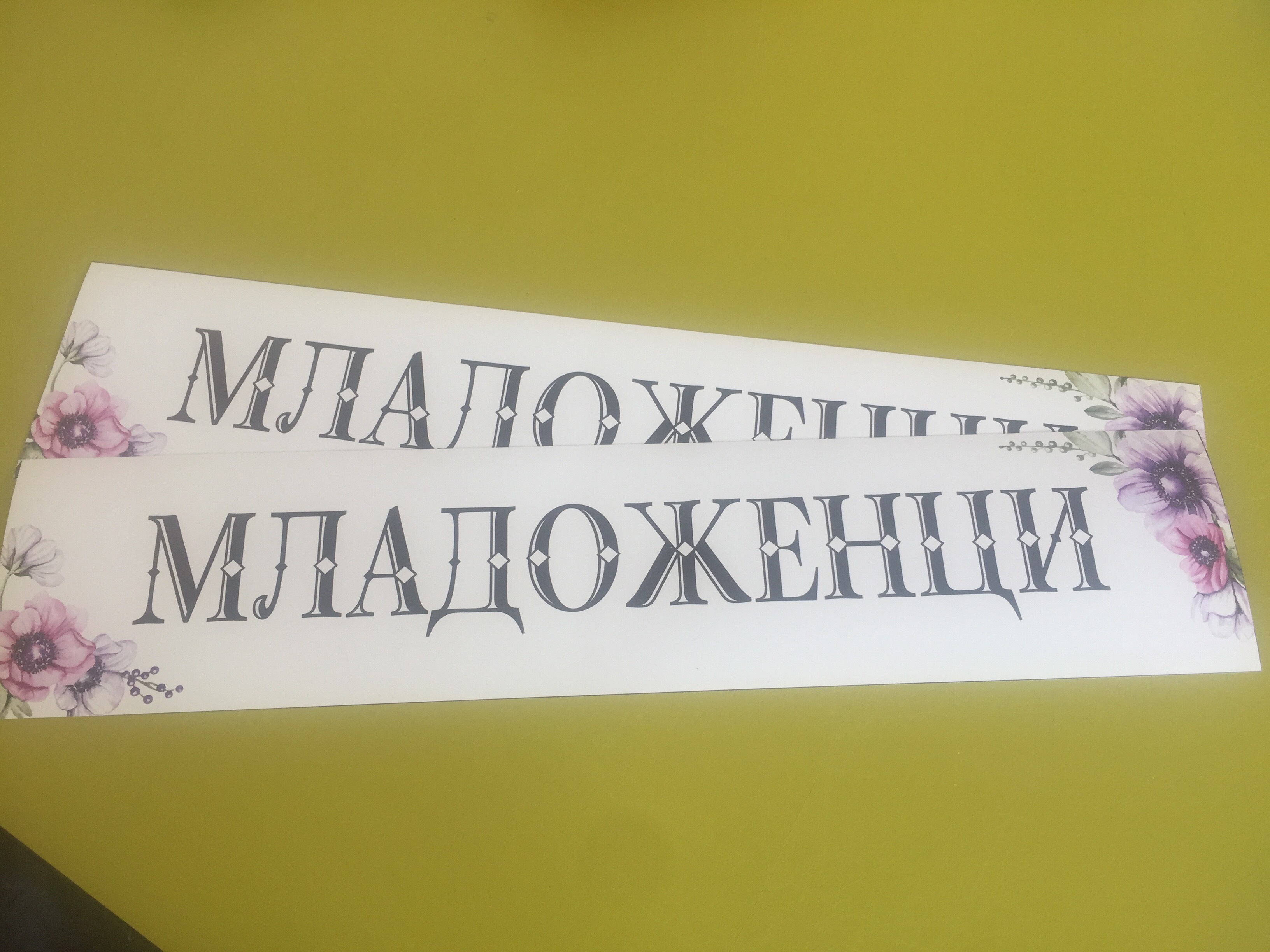 Стикер „Младоженци“, отпечатан върху самозалепващо ПВЦ фолио с размери 11х51 см