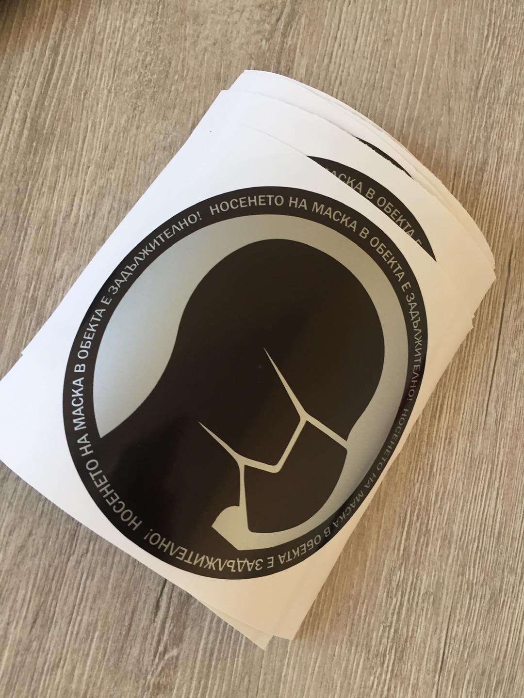Стикер “Носенето на маска в обекта е задължително”с диаметър 11 см, отпечатан върху сиво металик самозалепващо ПВЦ фолио